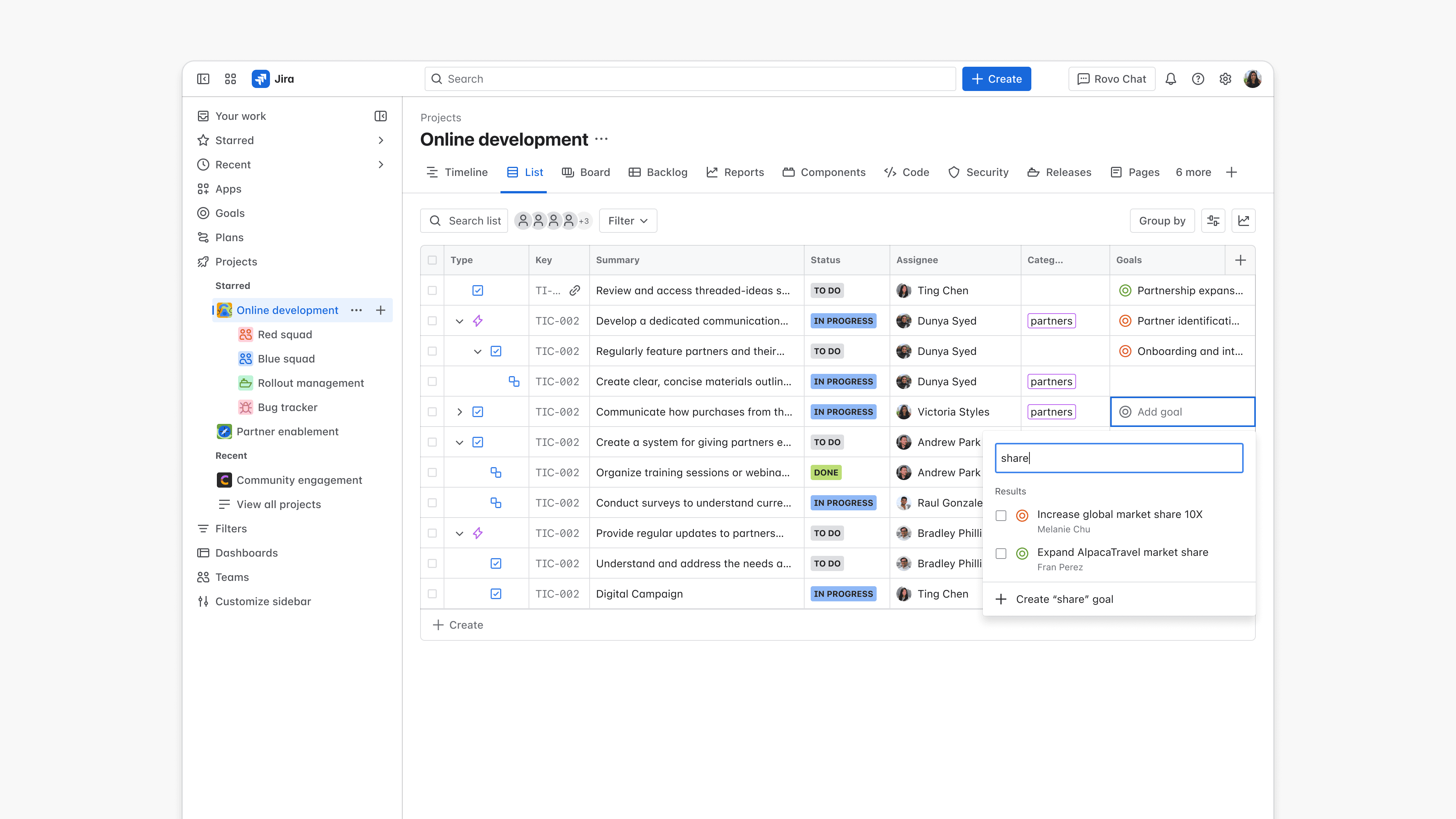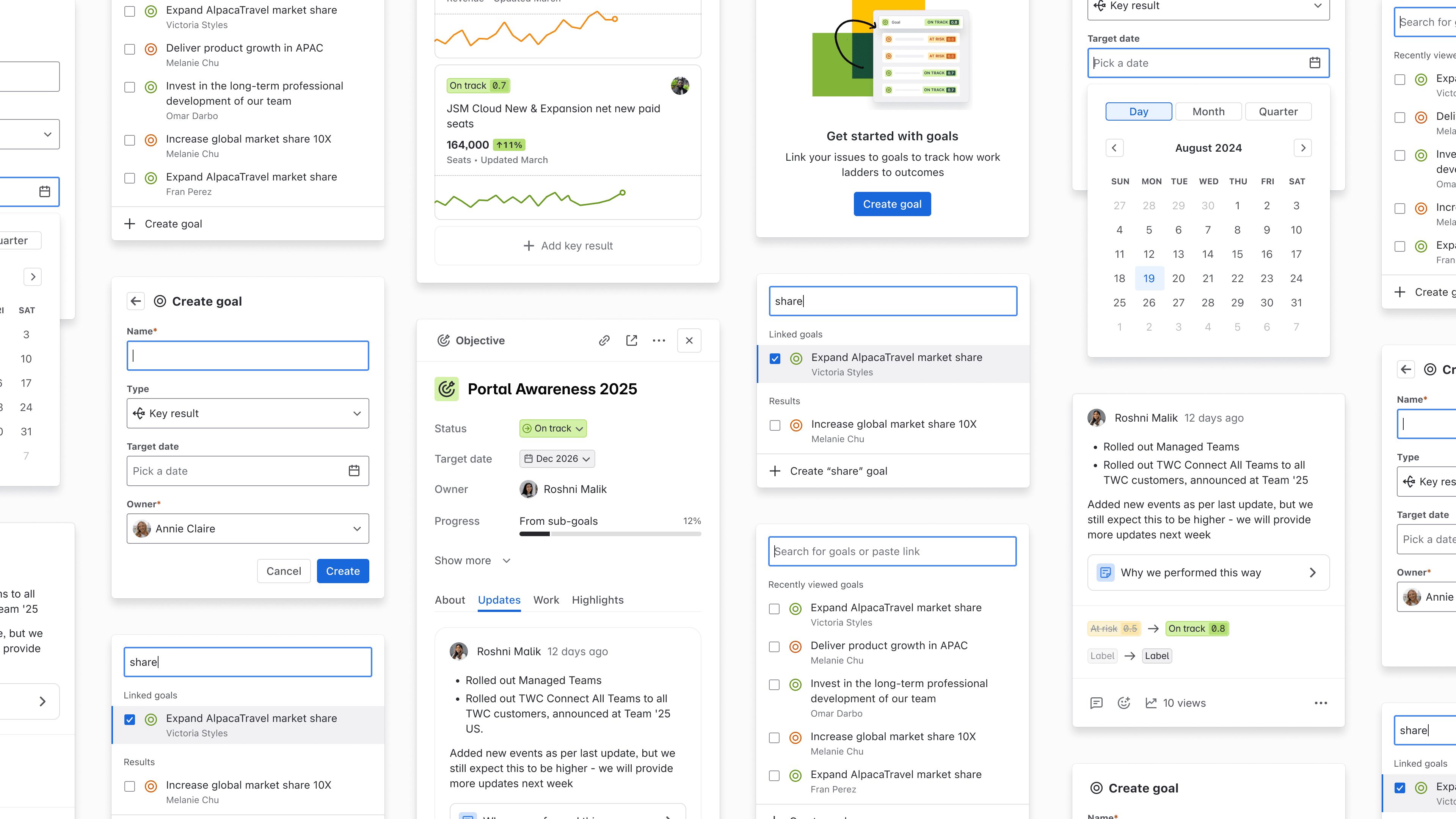 I designed a component for searching, creating and linking goals which could be used across Jira (the issue detail view, and this table view), as well as being used to link other objects (such as people and projects) and across apps.